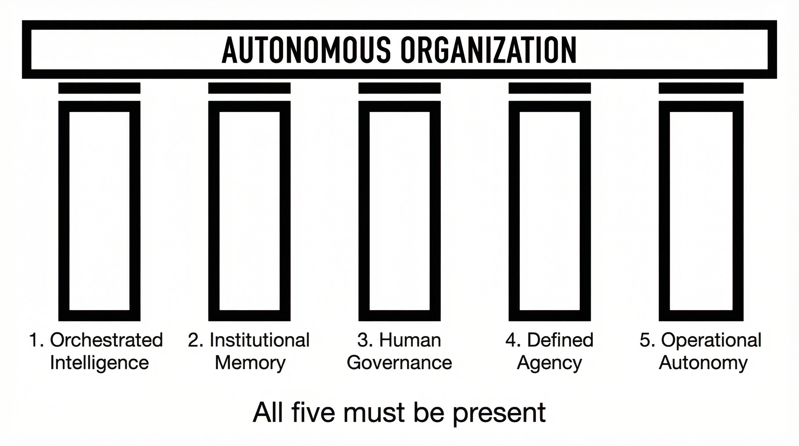 Every autonomous organization needs five pillars: Memory, Context, Tools, Verification, and Orchestration. Miss one and the system collapses.