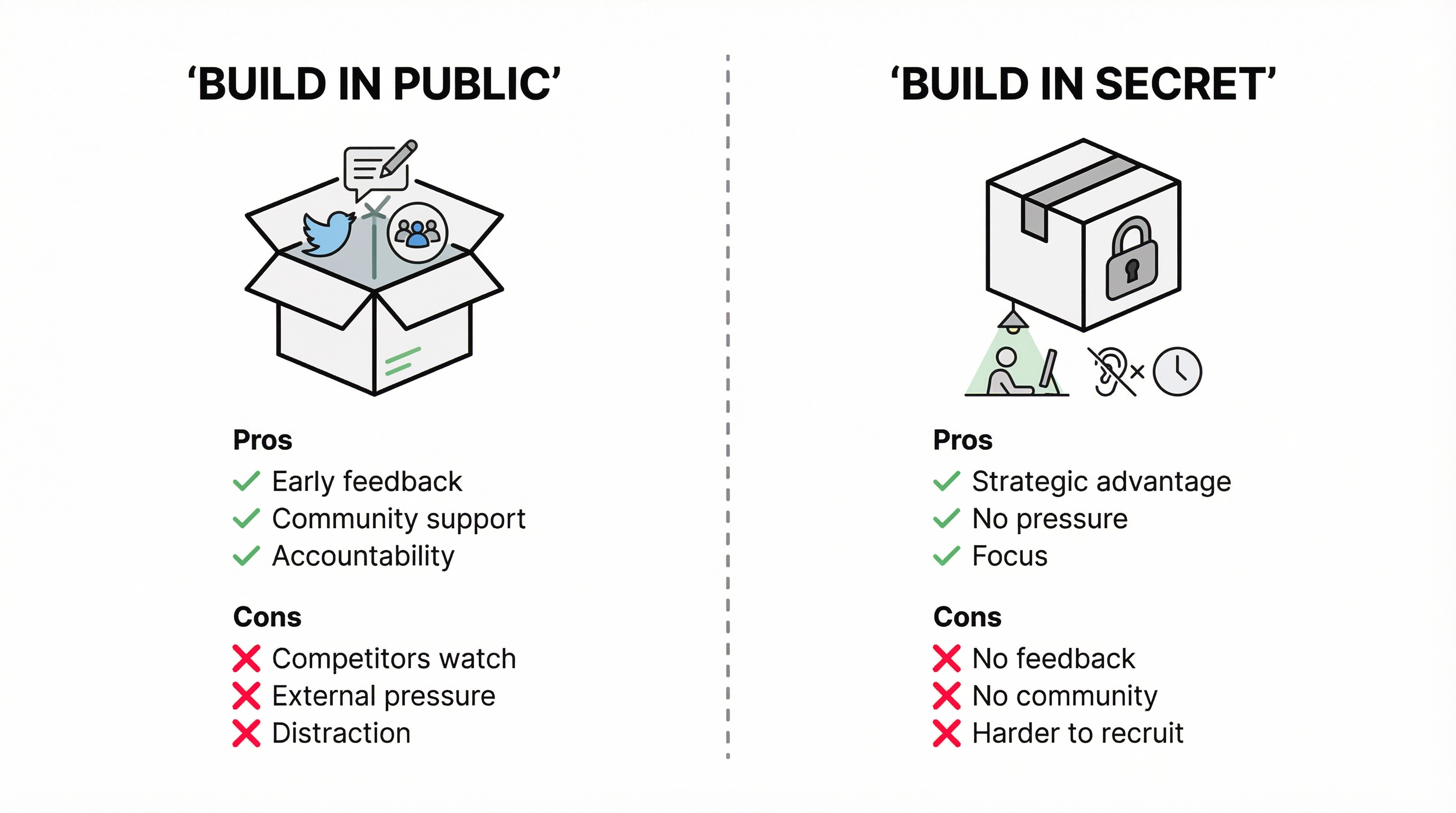 The startup playbook says: Build in public. Tweet your progress. Share your metrics. Document your failures. Be transparent.